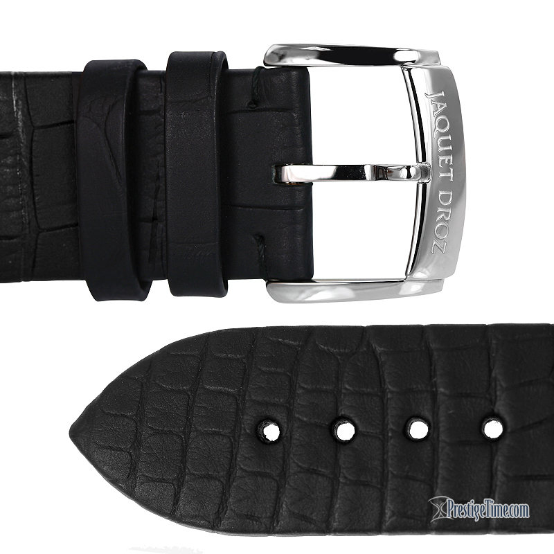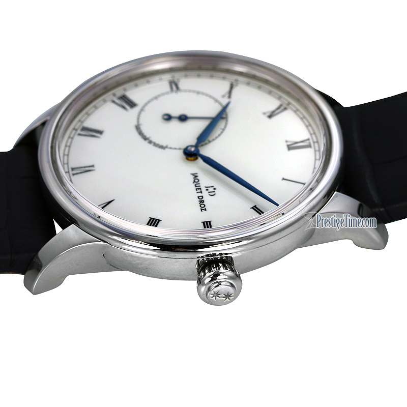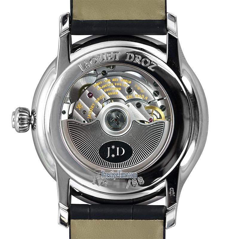 • Small seconds sub-dial located at the 9 o'clock position.Jaquet Droz Caliber 1663.4, beats at 28,800 vph, contains 32 Jewel.