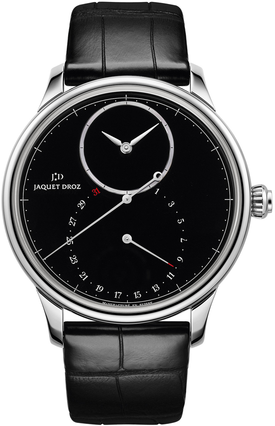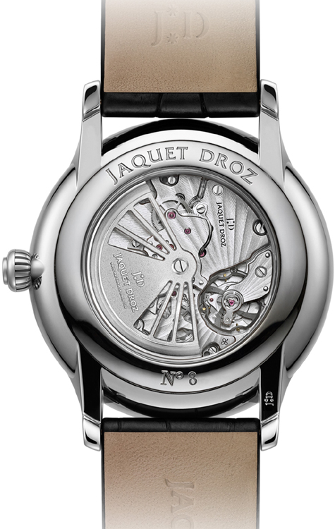 • Jaquet Droz Caliber 2695SMR with silicon balance spring and pallet horns, beats at 21,600 vph, contains 34 Jewels & has an approximate power reserve of 38 hours.