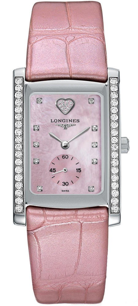 Stainless steel case, Pink leather strap, Bezel set with 36 diamonds (aprox. 0.90 carats) Pink Mother of Pearl dial with 10 diamond hour markers, Diamond heart at 12, Small seconds dial at 6.