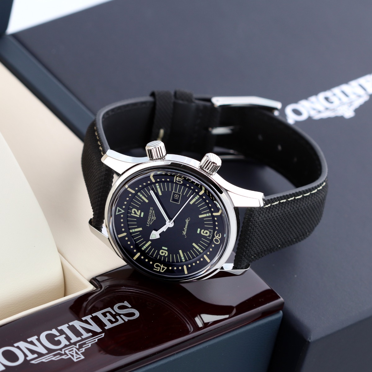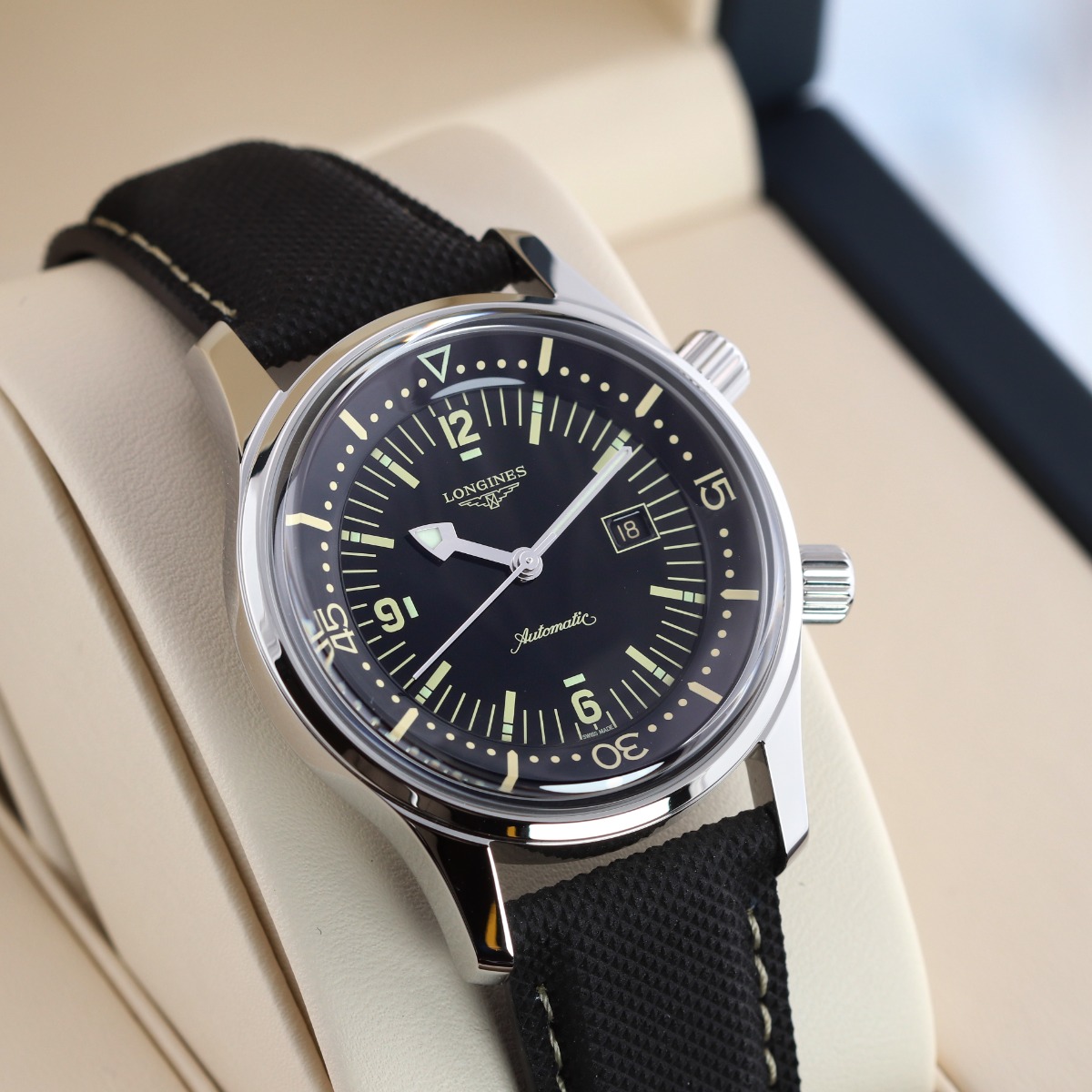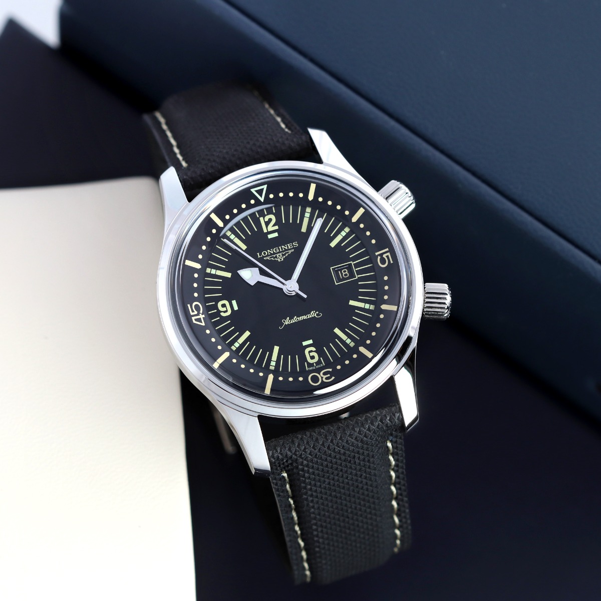 The Longines Legend Diver is a reissue of a 1960 diving watch by Longines. While maintain the overall spirit & design of the original watch, Longines has updated the watch with modern upgrades such as a sapphire crystal, screw in crowns & a screw in case back allowing for an impressive 300 water resistance rating.