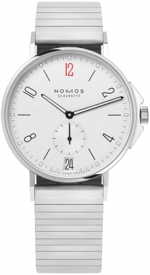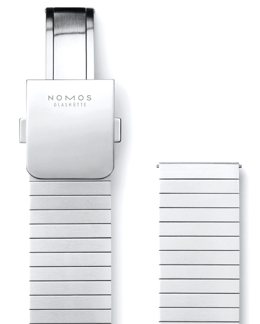 • Rhodium plated surfaces with Glashütte ribbing and NOMOS perlage decoration.