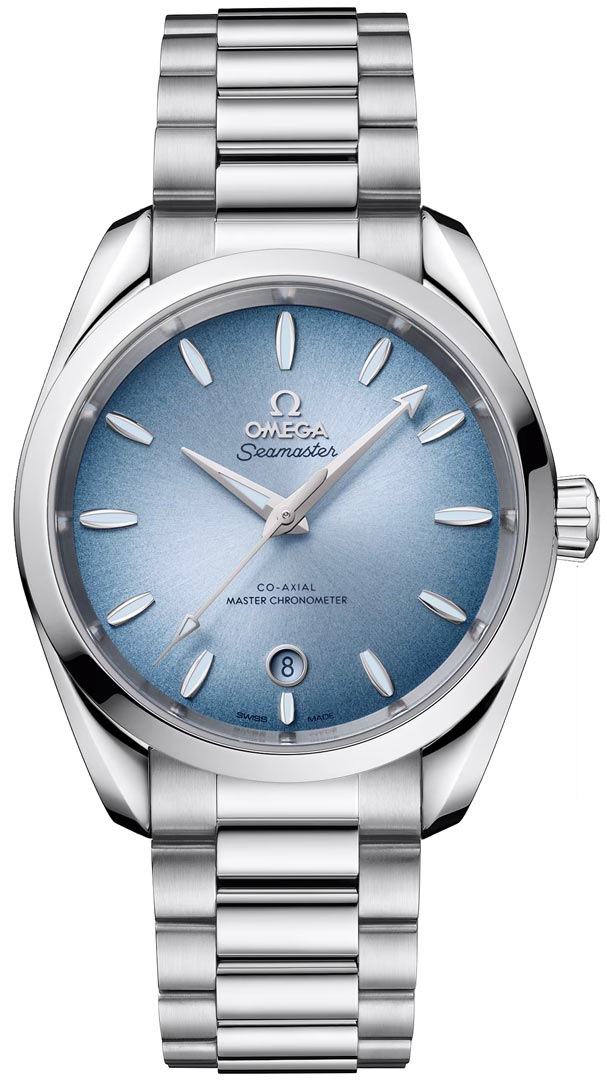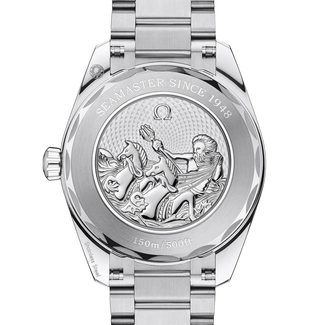 AQUA TERRA 150M SUMMER BLUE COLLECTION. The case back features the Seamaster logo depicting a trident-bearing Poseidon and two seahorses: OMEGA’s 1956 original and the brand’s current design.
