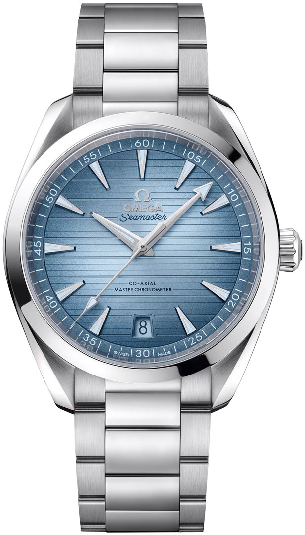 AQUA TERRA 150M SUMMER BLUE 75th Anniversary COLLECTION. The case back features the Seamaster logo depicting a trident-bearing Poseidon and two seahorses: OMEGA’s 1956 original and the brand’s current design.