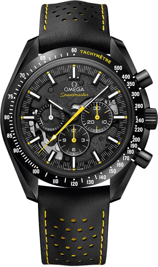 • Polished black ceramic crown with an engraved & luminous filled Omega logo.