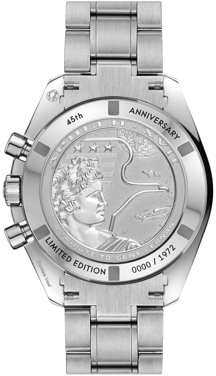 • The case back is engraved with '45th ANNIVERSARY - LIMITED EDITION xxxx/1972' and features an embossed Apollo XVII mission patch & an embossed 'APOLLO XVII - A TRIBUTE TO GENE CERNAN'.