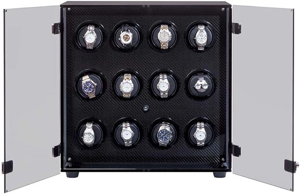 Upright standing winder case with 12 watch capacity featuring smoked tempered glass case that is 10mm in thickness with a carbon fiber faceplate. Rests on four legs and has 6mm thick tempered glass doors with brushed nickel hinges and lock. Houses twelve watch winders that use the Oribita Rotorwind® technology. Rotorwind® technology swings the watch instead of simply rotating it. This mimics the action of a person's wrist more naturally and uses very little power. Battery life can be measured in years instead of months thanks to its low-current draw-drive motor.
