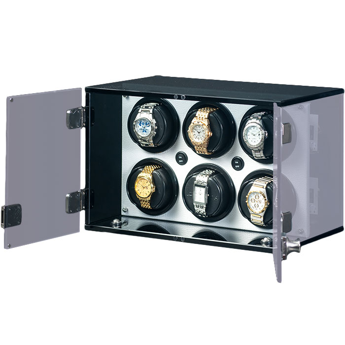 Upright standing winder case with 6 watch capacity featuring smoked tempered glass case that is 10mm in thickness with a white leatherette faceplate. Rests on four legs and has 6mm thick tempered glass doors with brushed nickel hinges and lock. Houses six watch winders that use the Oribita Rotorwind® technology. Rotorwind® technology swings the watch instead of simply rotating it. This mimics the action of a person's wrist more naturally and uses very little power. Battery life can be measured in years instead of months thanks to its low-current draw-drive motor.