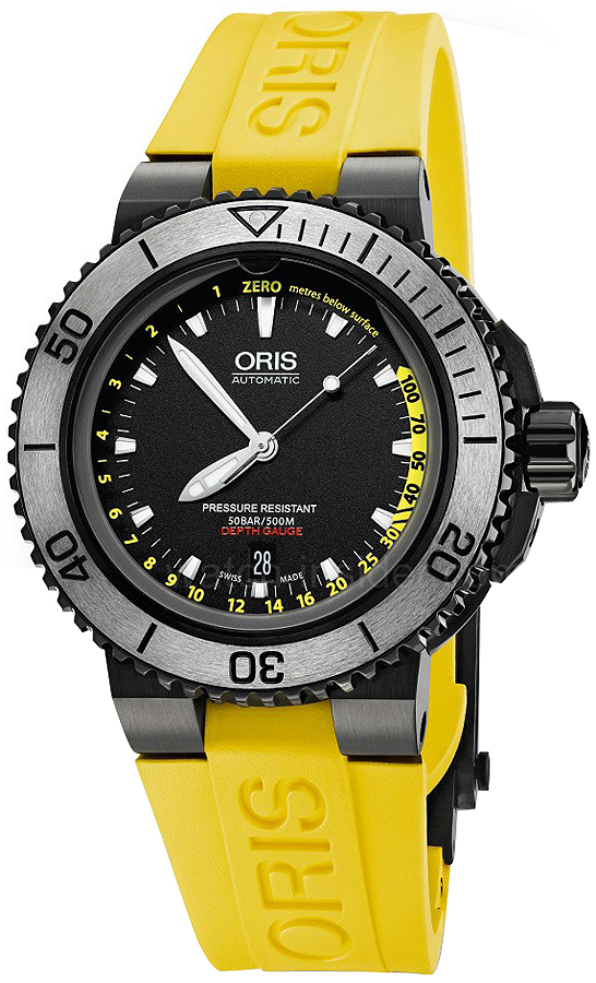 Features Oris's unique & patented Depth Gauge: Water enters a channel in the sapphire crystal itself via an inlet at the 12 o'clock position. As the water pressure increases at depth, the air inside the channel gets compressed - the line where water and air meet indicates the depth. The depth scale indications is printed in yellow on the dial perimeter & is indicated in meters (from 0-100m).