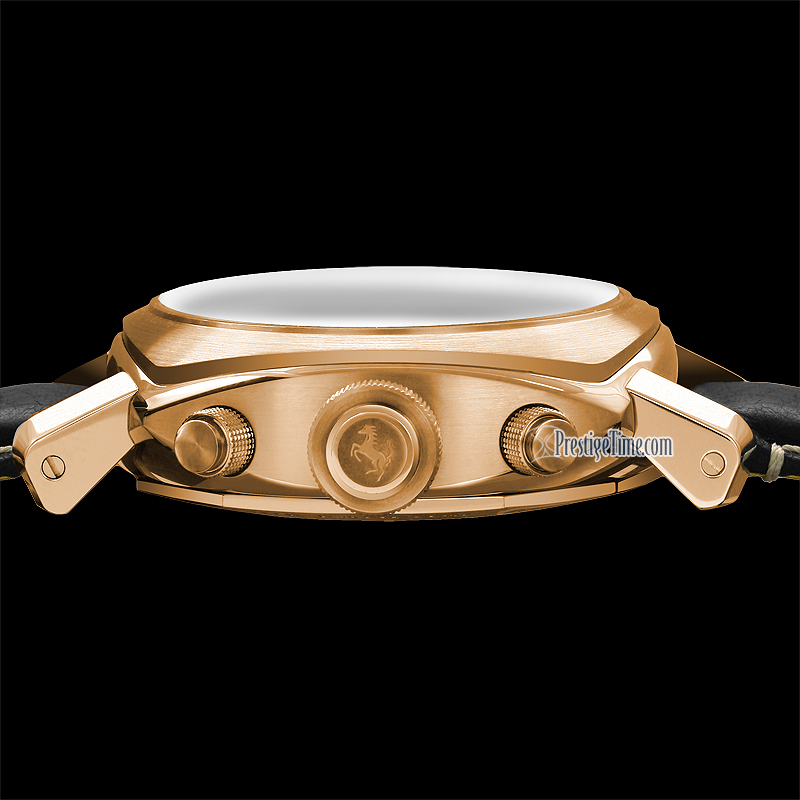 • Black Crocodile Strap with white stitching & red backing, equipped with a Ferrari branded Solid Rose Gold Deployant Buckle.