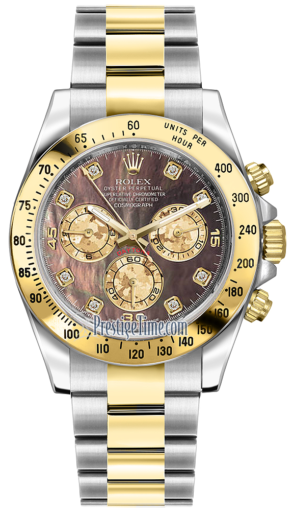 Mens Rolex 116523 Black MOP Diamond Cosmograph Daytona Steel and Gold Watch