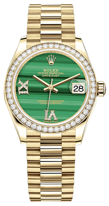 Ladies Rolex 278288rbr Malachite Diamond President Datejust 31mm Yellow Gold Watch