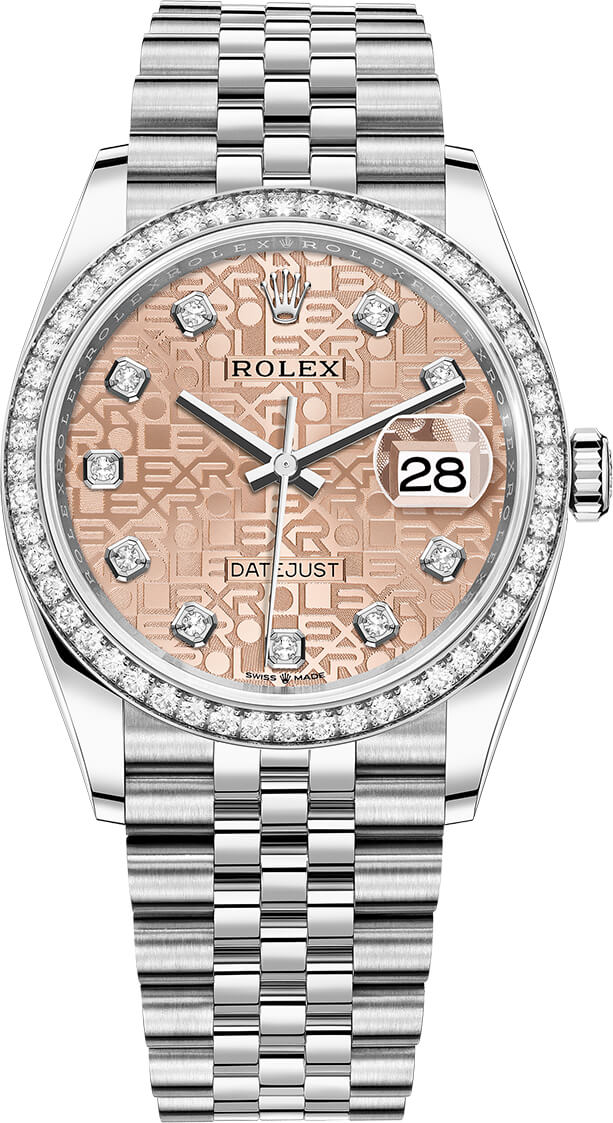 • Pink JUBILEE dial, featuring the ROLEX name repetitively embossed on the dial.