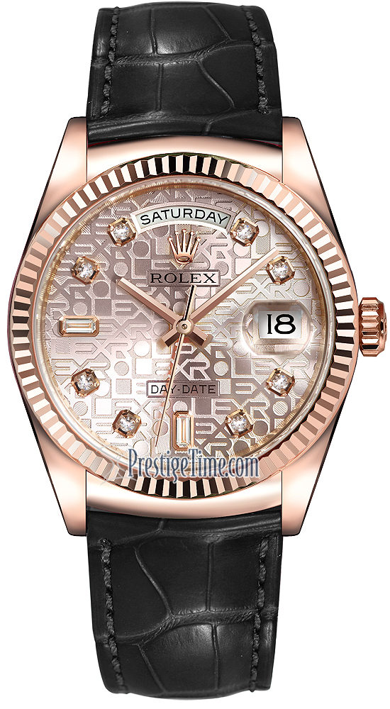 Midsize Rolex 118135 Pink Jubilee Diamond Leather Day-Date 36mm Everose Gold Fluted Bezel Watch