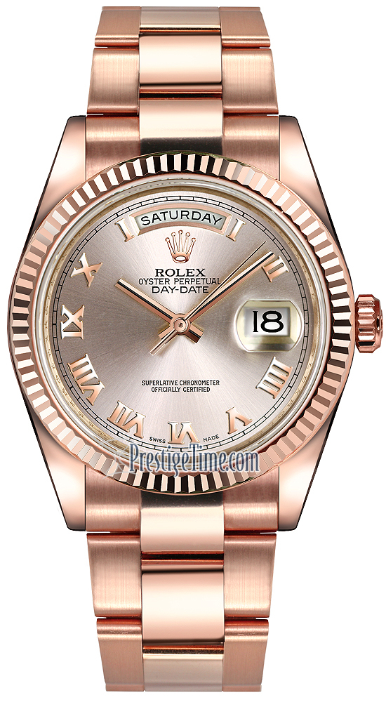 Midsize Rolex 118235 Pink Roman Oyster Day-Date 36mm Everose Gold Fluted Bezel Watch