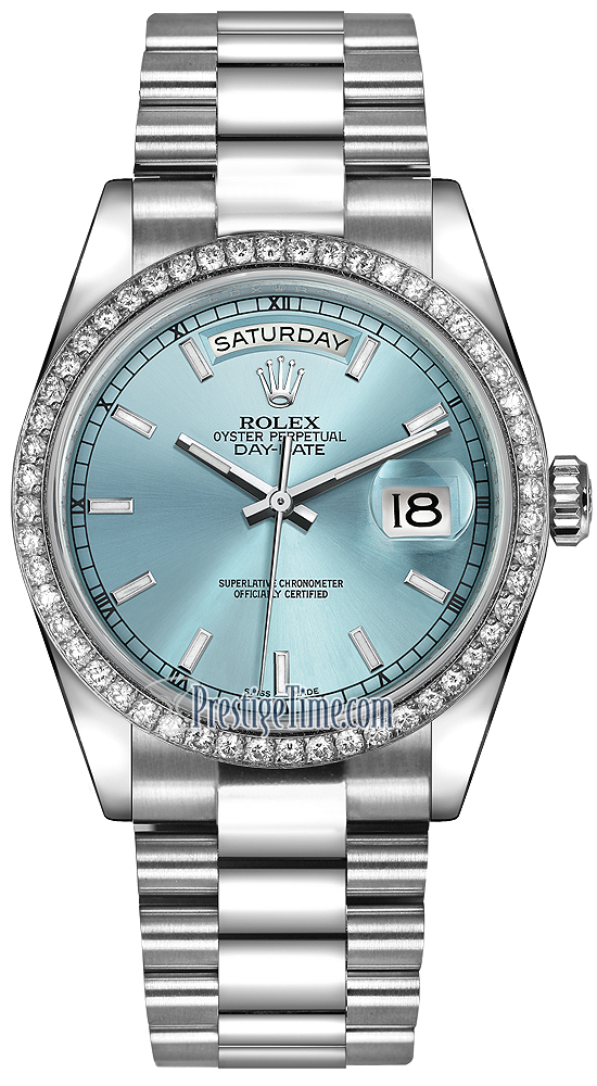 Midsize Rolex 118346 Ice Blue Index President Day-Date 36mm Platinum Diamond Bezel Watch
