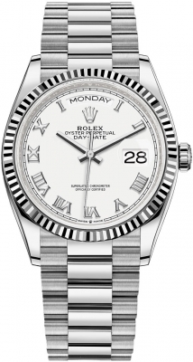 Midsize Rolex 128239 White Roman Day-Date 36mm White Gold Watch