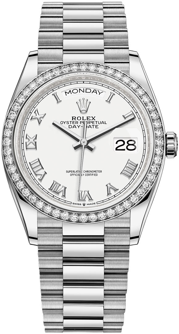 Midsize Rolex 128349RBR White Roman Day-Date 36mm White Gold Watch