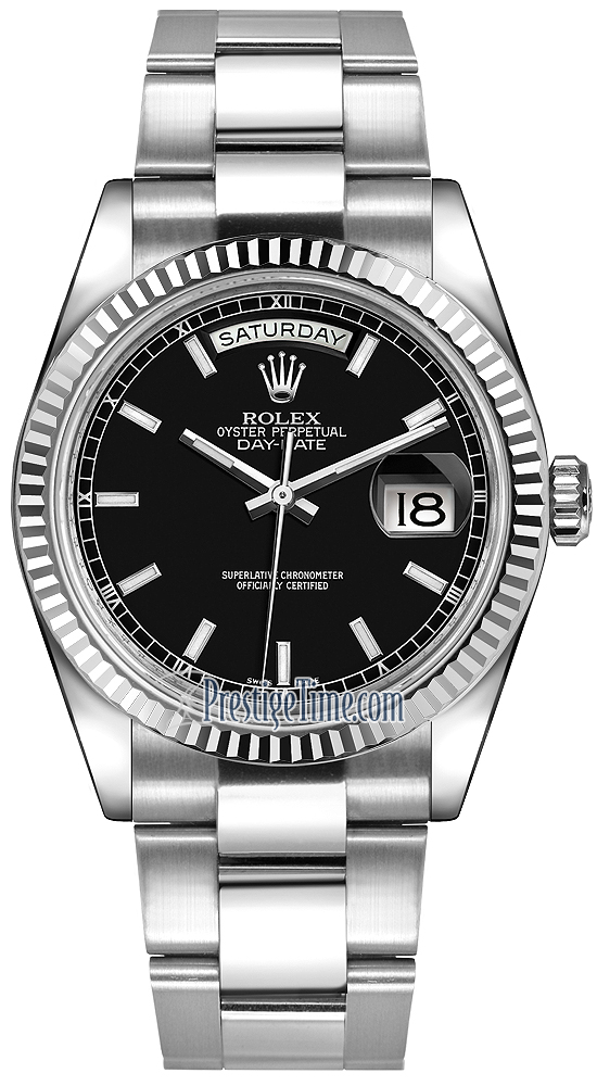 Midsize Rolex 118239 Black Index Oyster Day-Date 36mm White Gold Fluted Bezel Watch
