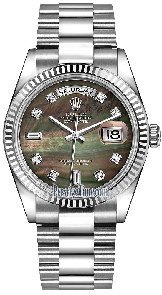 Midsize Rolex 118239 Black MOP Diamond President Day-Date 36mm White Gold Fluted Bezel Watch