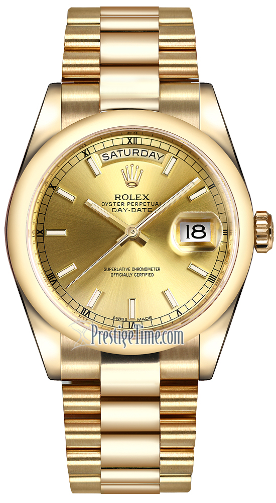 Midsize Rolex 118208 Champagne Index President Day-Date 36mm Yellow Gold Domed Bezel Watch