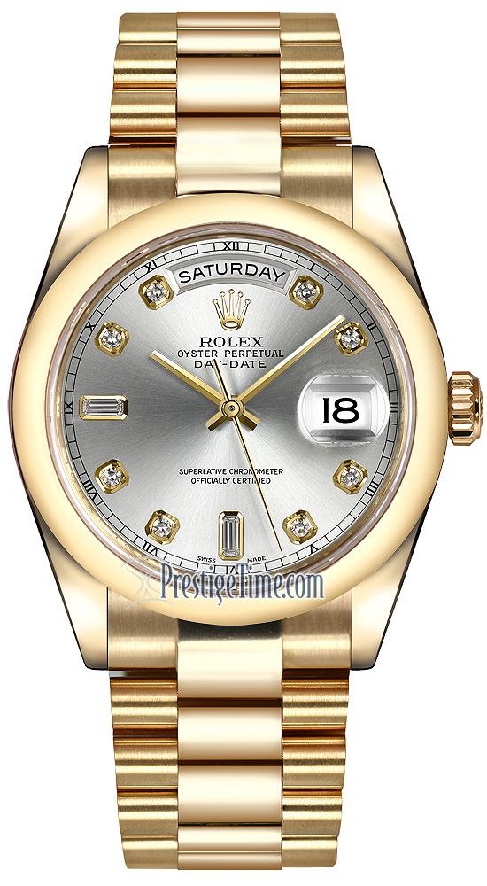 Midsize Rolex 118208 Silver Diamond President Day-Date 36mm Yellow Gold Domed Bezel Watch
