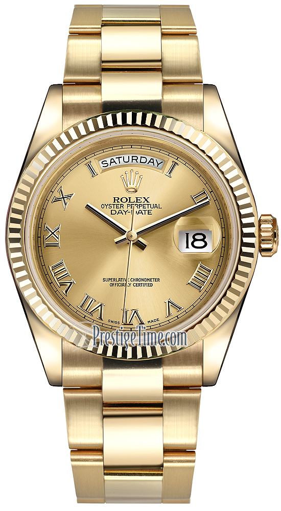 Midsize Rolex 118238 Champagne Roman Oyster Day-Date 36mm Yellow Gold Fluted Bezel Watch