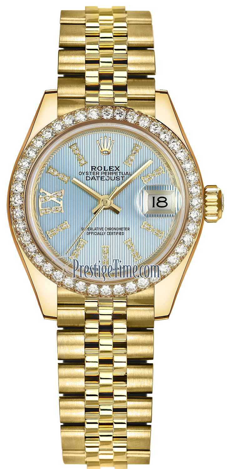 Ladies Rolex 279138RBR Cornflower Blue 44 Diamond Jubilee Lady Datejust 28mm Yellow Gold Watch