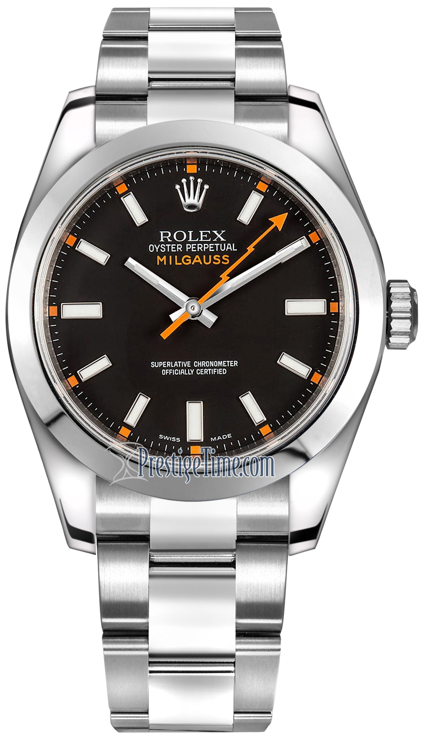 The Rolex Oyster Perpetual Milgauss is designed to withstand magnetic fields of up to 1000 gauss - hence the name MILgauss, MILLE being the French word for 1000. The watch features a metal shield inside the case which surrounds & protect the movement. The shield is made of ferromagnetic alloys selected by Rolex to protect the movement from magnetic fields.