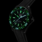 • Sand-blasted black DLC coated stainless steel uni-direction turning bezel with a bezel insert made from a fusion of carbon fiber & green Superluminova, and featuring a luminous 5 minute scale.