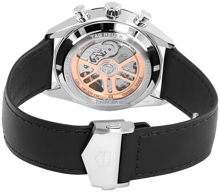 • Tag Heuer Calibre HEUER 02, beats at 28,800 vph (4Hz), contains 33 jewels & has an approximate power reserve of 80 hours (or +/- 65 hours if the chronograph function is running).