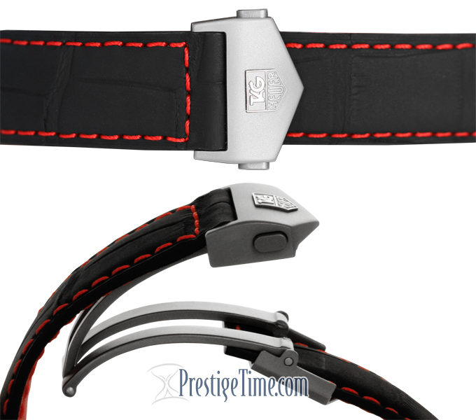 • Matte black crocodile strap with red stitching to match the highlights on the dial & bezel. With a push button deployant buckle.