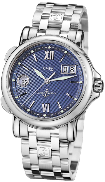 Blue Textured Dial with Roman Numeral & Stick hour indicators, Automatic Movement, Big Date Diplayed at the 2 o'clock position, Second Time Zone at the 9 o'clock postion, Luminous Hands & Hour Markers.