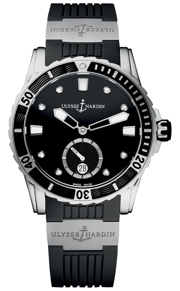 • Black rubber strap with titanium elements engraved with the Ulysse Nardin logo.