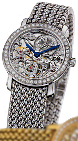 Beautifully Crafted Skeleton Watch. Front & Back are of Sapphire Crystal with Blued Metal Hands. All parts are beautifully hand engraved & finished to perfection. Bezel & Case Edges set with 73 VS1 Top Wesselton Quality Round Diamonds. Matching Solid 18kt White Gold Mesh Style Bracelet. Aprox. 31 hour power reserve.