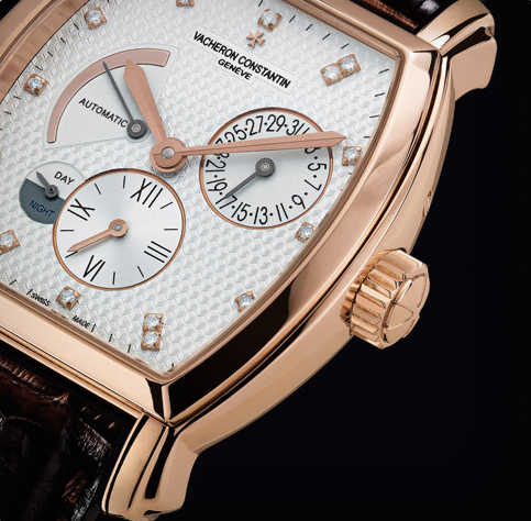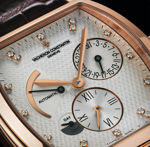 • Silverized Guilloche textured dial with applied diamonds hour markers.