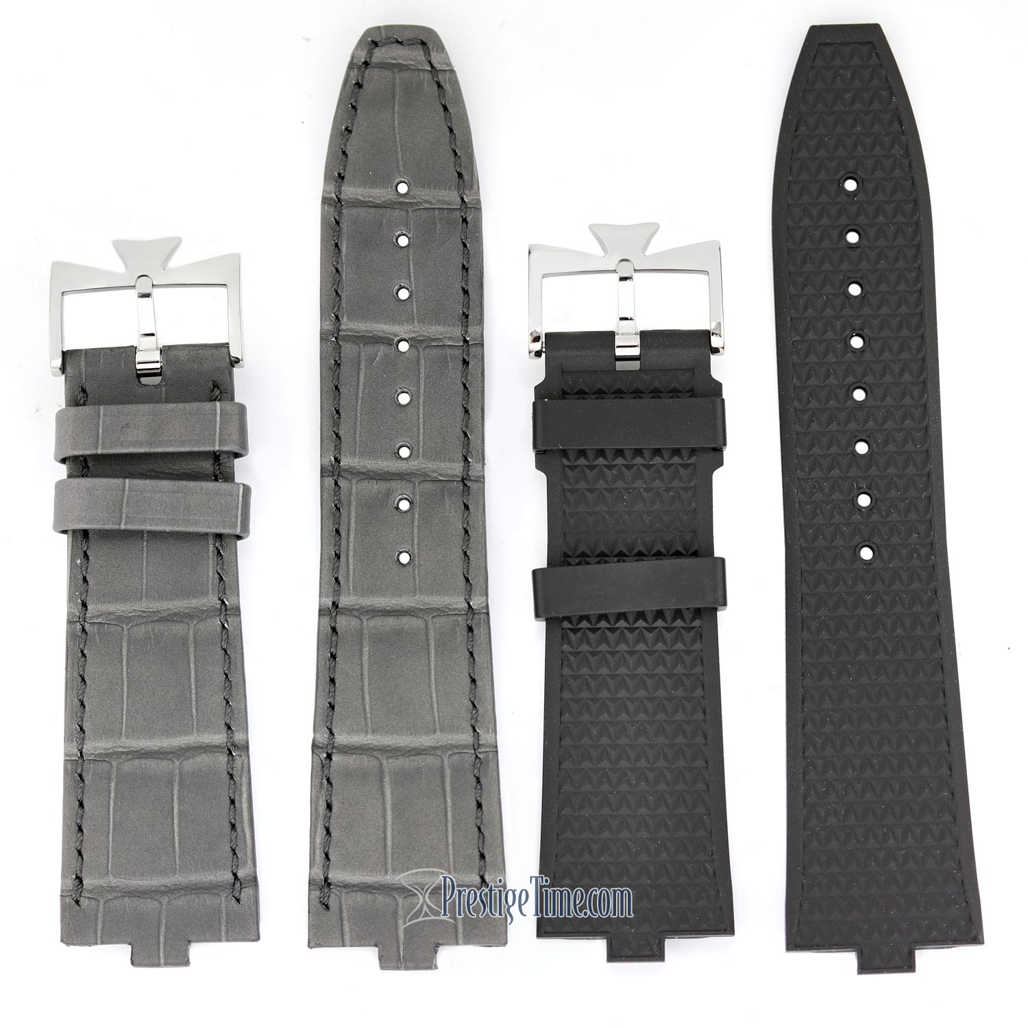 1. Grey alligator leather strap with a white gold tang buckle.