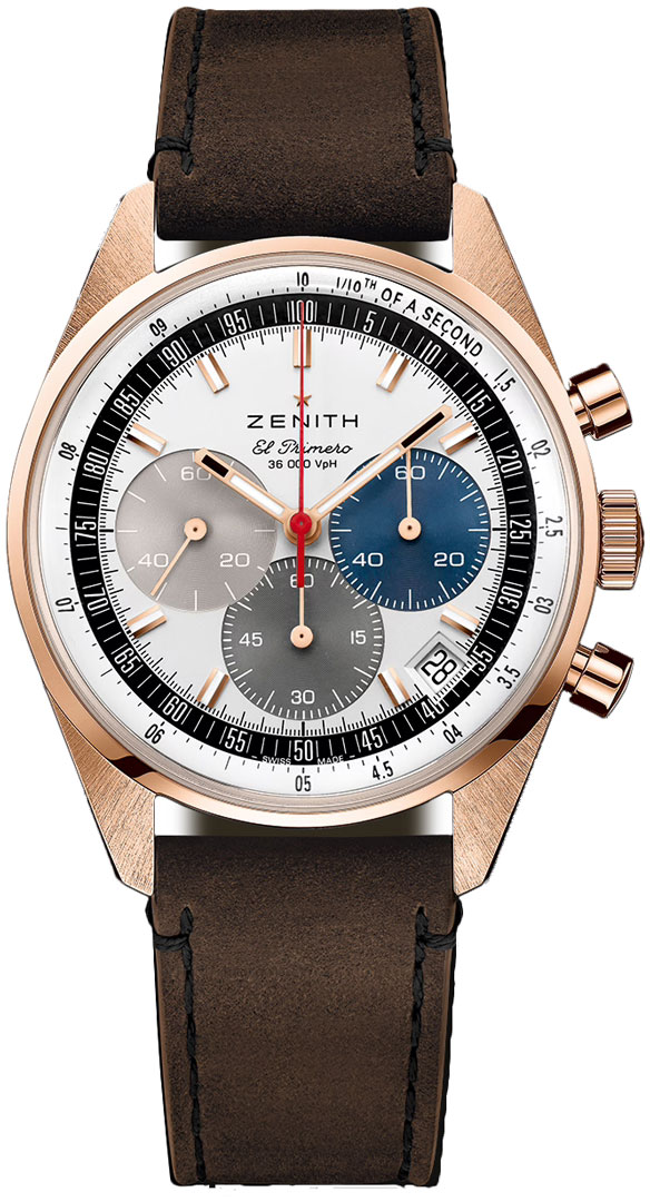 • Zenith in-house caliber El Primero 3600, beats at 36,000 vph (5Hz), contains 35 jewels & has an approximate power reserve of 60 hours.