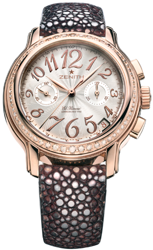 18kt Rose Gold Case, Bezel Set with 64 Brown diaomonds (aprox. 0.69ct total weight), Brown Galuchat Leather Strap with RG Deployment Buckle, Silver Guilloche Dial, Bold Rose Gold Toned Arabic Numeral Hour Markers. The Famous El Primero Certified COSC Automatic Chronograph Movement, date displayed between 4 & 5 o'clock position, Stop-Watch Functions.