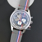 TOUR AUTO EDITION: The watch is branded with the blue, white & red racing colors. with the tricolor combo running its stripes from the top strap, down through the dial to the bottom strap. The colors highlight the watch in other areas as well, such as fine rims on the chrono buttons, the chrono seconds counters & hands. The Tour Auto logo is printed on the sapphire crystal case back.