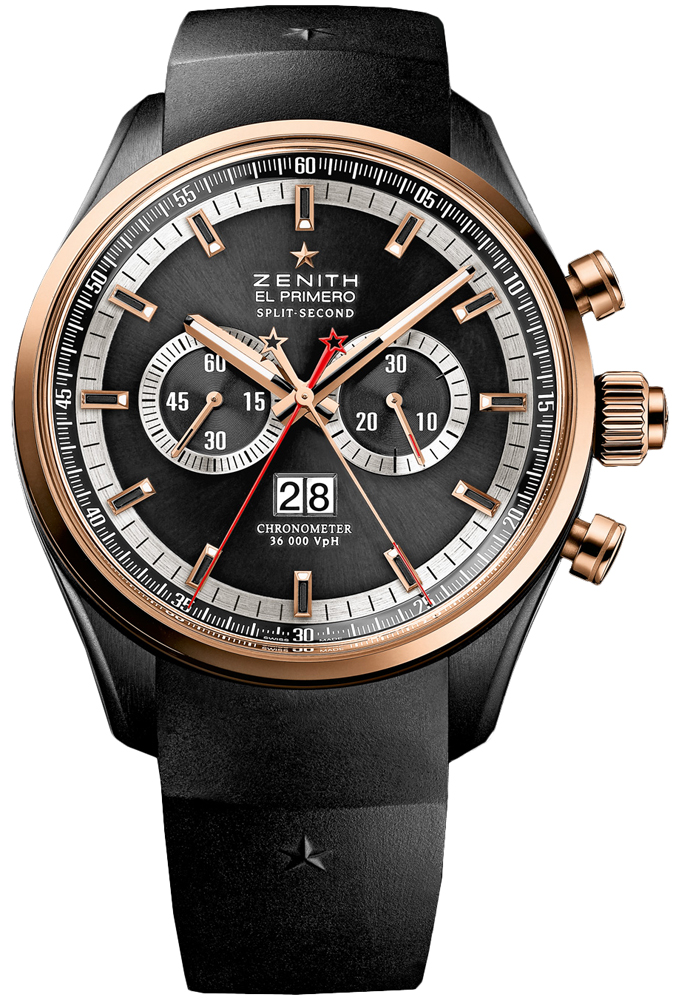 • Large red central Rattrapante seconds hand directly beneath (with the Zenith star logo as a counterweight).