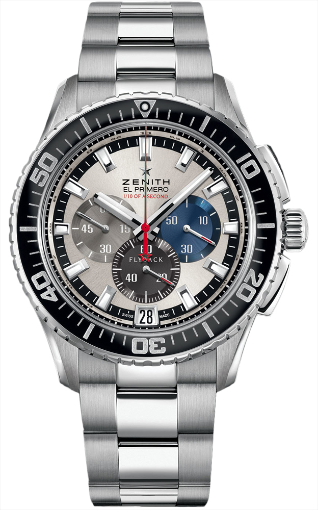 • Large red central seconds hand makes a single turn in 10 seconds. Hand features the Zenith star at its base.