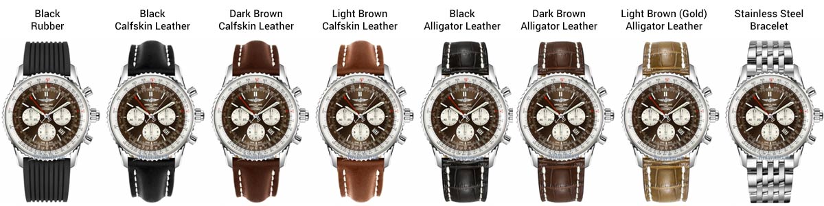 Like all Breitling watches, with this automatic flyback chronograph, you can have almost any type of strap you wish. This particular collection has models available with several leather straps which include either a tang (pin) buckle or a folding buckle. The available straps and buckles are: