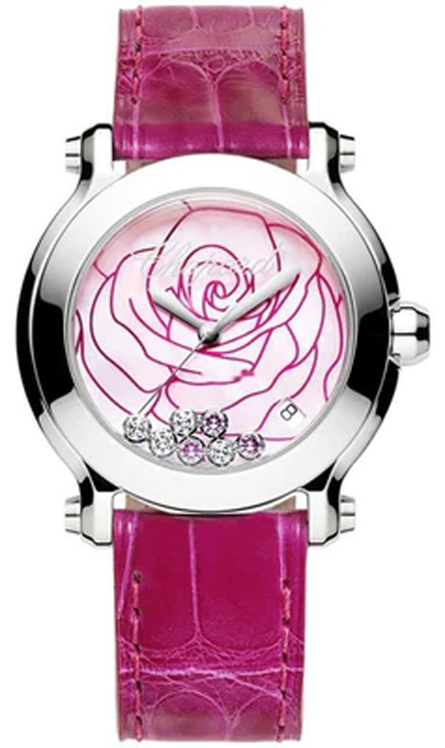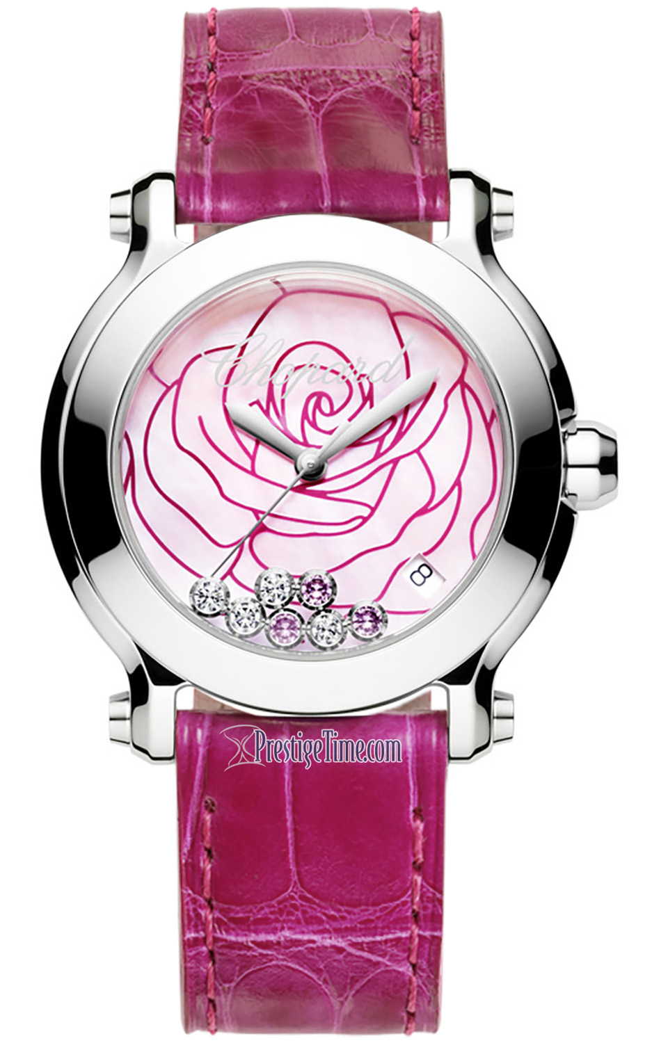 • Unique pink mother of pearl dial with a delicately contoured rose motif on the dial.