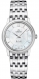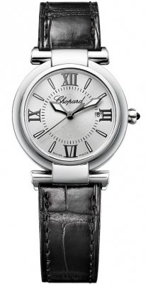 • Two-tiered white mother-of-pearl dial with polished steel Roman numerals and index hour markers.