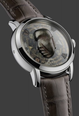 Finally, it required all Michel Butor's talent to give voice, if not life, to the masks.  A short poem dedicated to each mask, circle the sapphire dial in letters of gold. The writer's lines follow each other in a spiral that seems to have no beginning and no end, a mysterious message that can only be read when the light strikes it from a certain angle.