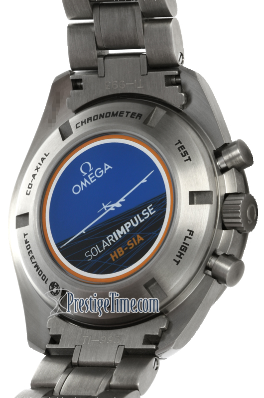 • The sapphire case back has the Solar Impulse mission patch printed on in color and is inscribed "OMEGA SOLARIMPULSE HB-SIA". In addition the case back has the following engraved around the patch "100m/330FT - CO-AXIAL - CHRONOMETER - TEST - FLIGHT - No. XXX".