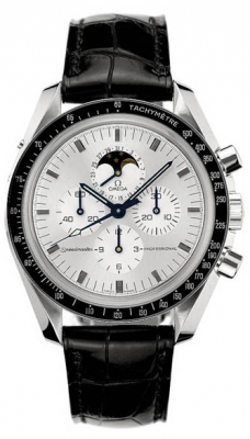 18kt White Gold Case, Black Leather Strap, Silver Dial, Black Bezel, Date & Moon Phase indicators at 12,Chronograph Functions, Manual Wind Movement 48 Hours Power Reserve.