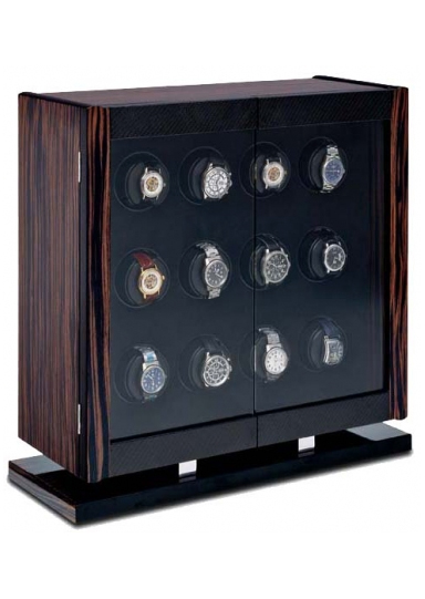 The AVANTI 12 watchwinder presents a very upscale, very modern case design of Italian construction finished in Macassar/Carbon fiber and fitted with 2 lockable, center-opening, safety glass doors.