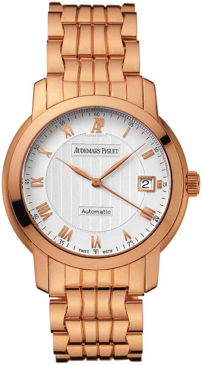 • AP Caliber 3120 with a 22-carat Yellow Gold Rotor which bears the AP family crest. The movement beats at 21,600 vph, contains 40 jewels & has an approximate power reserve of 60 hours.