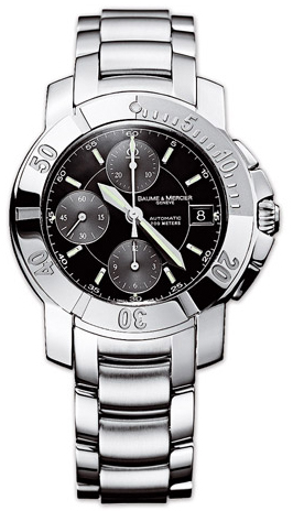 Polished Stainless Steel case and bracelet, Black dial with luminous hands and hour markers, Grey sub dials, Displays date at 3, Screw down fluted crown.